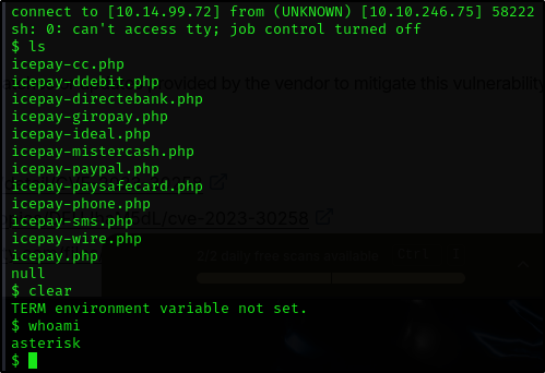 uid=0(root) gid=0(root) groups=0(root),1001(asterisk)