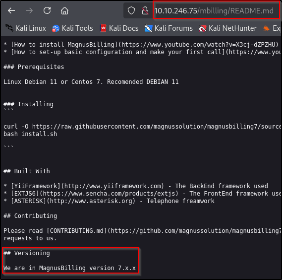 После проверки GitHub‑репозитория MagnusBilling и изучения файловой системы мы можем получить доступ к файлу README.md и увидеть версию приложения.