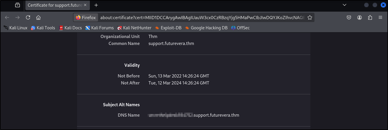 После посещения поддомена поддержки и проверки SSL-сертификата мы видим секретный поддомен:
