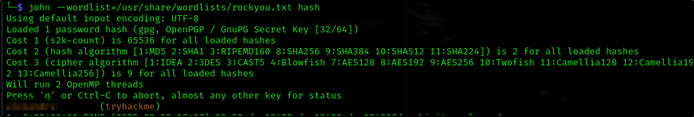 И давайте используем gpg2john, чтобы взломать файл tryhackme.asc