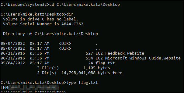 В учётных данных Windows сохранён пароль. Используя cmdkey и runas, запустите оболочку от имени mike.katz и получите флаг с его рабочего стола.
