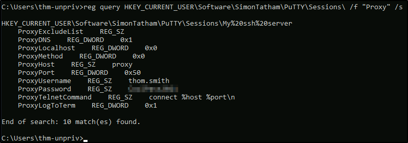 Получите сохранённый пароль из сохранённой сессии PuTTY в вашем профиле. Какой пароль у пользователя thom.smith?