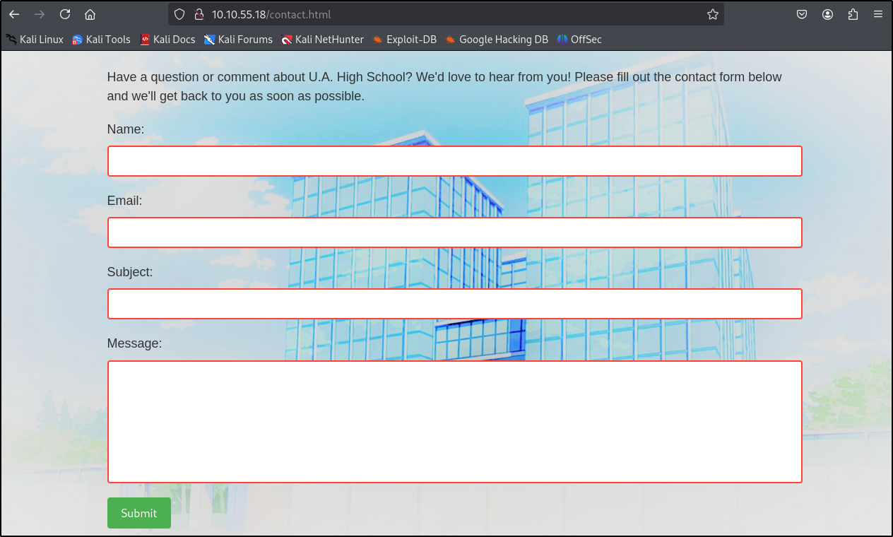 Мы можем увидеть форму обратной связи по адресу 10.10.55.18/contact.html