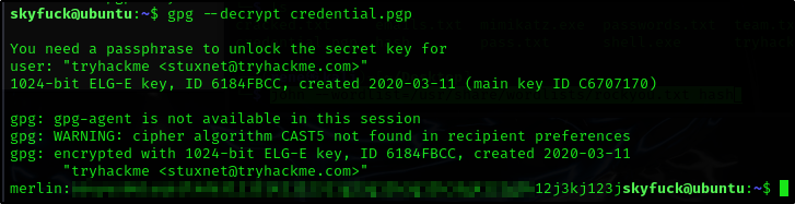 skyfuck@ubuntu:~$ gpg --decrypt credential.pgp